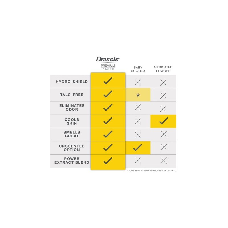 * Fremstillet i USA med premium ingredienser: Sig farvel til billige apotekspulvere for evigt. Chassis Premium Body Powder indeholder ikke talkum, aluminium, parabener eller menthol. I stedet bruger den bagepulver, græskarfrø, humleekstrakt, aloe og andre naturlige ingredienser.